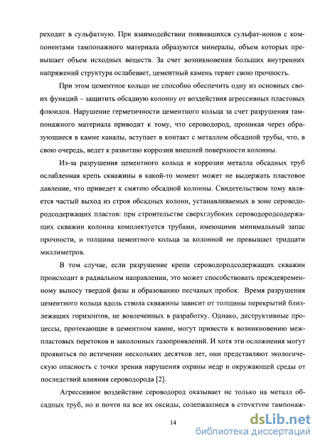 Цементный камень постоянно контактирует с пластовыми флюидами, в то же время цементное кольцо должно защищать металл обсадных труб от агрессивного воздействия содержащегося в газе сероводорода. Отсутствие коррозии объясняется тем, что под цементной оболочкой, находясь в щелочной среде, сталь пассивна. Коррозия металла зацементированных обсадных колонн возникает тогда, когда поверхность металла не полностью пассивированна при цементирова ний скважины или пассивирующий слой нарушен в процессе ее эксплуатации. Длительное воздействие на цементный камень агрессивных сред приводит к физико-механическим изменениям материала, что негативно влияет на состояние металлоконструкций под цементной оболочкой [61].