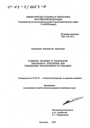 Хамитьянов Нигаматьян Хамитович. Развитие техники и технологии локального крепления для повышения продуктивности скважин : диссертация ... кандидата технических наук : 25.00.15.- Бугульма, 2002.- 155 с.: ил. РГБ ОД, 61 03-5/1063-0