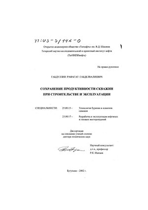 Габдуллин Рафагат Габделвалиевич. Сохранение продуктивности скважин при строительстве и эксплуатации : диссертация ... доктора технических наук : 25.00.15, 25.00.17.- Бугульма, 2002.- 298 с.: ил. РГБ ОД, 71 03-5/142-8