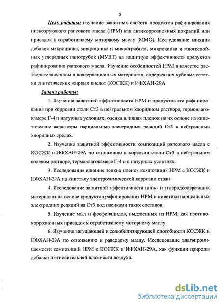 Цель работы: изучение защитных свойств продуктов рафинирования низкоэрукового рапсового масла (НРМ) как антикоррозионных покрытий или присадок к отработавшему моторному маслу (ММО). Исследование влияния добавок микроцинка, микроцинка и микрографита, микроцинка и многослойных углеродных нанотрубок (МУНТ) на защитную эффективность продуктов рафинирования рапсового масла. Изучение особенностей НРМ в качестве растворителя-основы в консервационных материалах, содержащих кубовые остатки синтетических жирных кислот (КОСЖК) и ИФХАН-29А