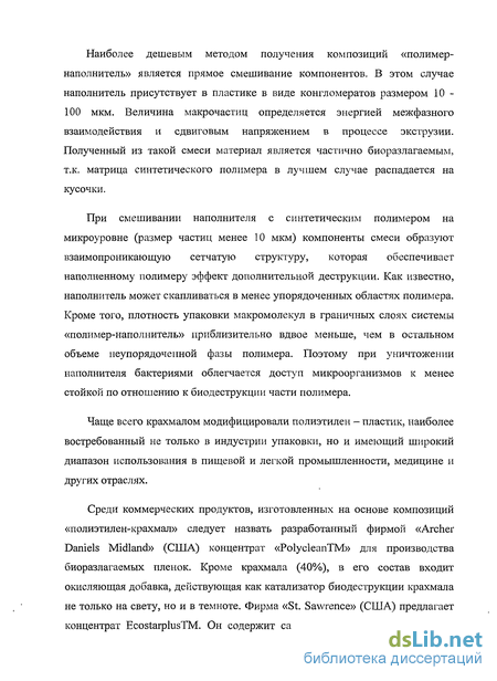 Весьма эффективный и распространенный способ придания биологической разрушаемости синтетическим полимерам является введение в полимерную композицию различных наполнителей, в частности крахмала, и других ингредиентов.