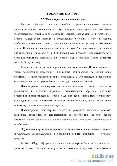 Болезнь Марека является наиболее распространенным лимфо-пролиферативным заболеванием кур, которое характеризуется развитием злокачественных лимфом в висцеральных органах (острая форма) и поражением нервов (классическая форма). В естественных условиях к болезни Марека наиболее чувствительны куры. Отчетливо проявляется возрастная устойчивость птицы. Наиболее восприимчивы цыплята в первые 2 недели жизни. Поголовное инфицирование происходит к 8-20-недельному возрасту. Заболеваемость у невакцинированного поголовья при острой форме болезни может достигать 60-80 % [3, 5, 43, 119].