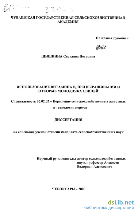 Для выполнения этой цели были поставлены следующие задачи: определение содержания витамина В6 в основных кормах, используемых в свиноводстве Чувашской республики; изучение влияния разного уровня пиридоксина на рост, мясную продуктивность, состав крови молодняка свиней в период выращивания и мясного откорма; выявление влияния добавления в рационы молодняка свиней витамина Вб и его разного уровня на переваримость питательных веществ кор- мов, обмен азота, кальция, фосфора и пиридоксина на организм подопытных животных; установление эффективности использования синтетического витамина В6 при мясном откорме свиней.