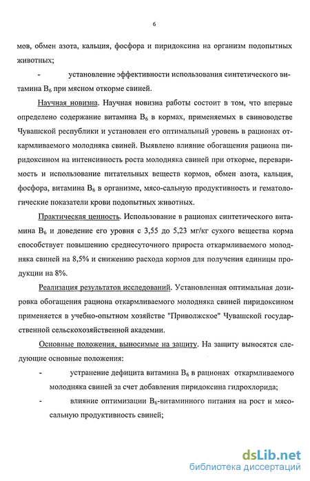Научная новизна. Научная новизна работы состоит в том, что впервые определено содержание витамина В6 в кормах, применяемых в свиноводстве Чувашской республики и установлен его оптимальный уровень в рационах откармливаемого молодняка свиней. Выявлено влияние обогащения рациона пиридоксином на интенсивность роста молодняка свиней при откорме, переваримость и использование питательных веществ кормов, обмен азота, кальция, фосфора, витамина Вб в организме, мясо-сальную продуктивность и гематологические показатели крови подопытных животных.