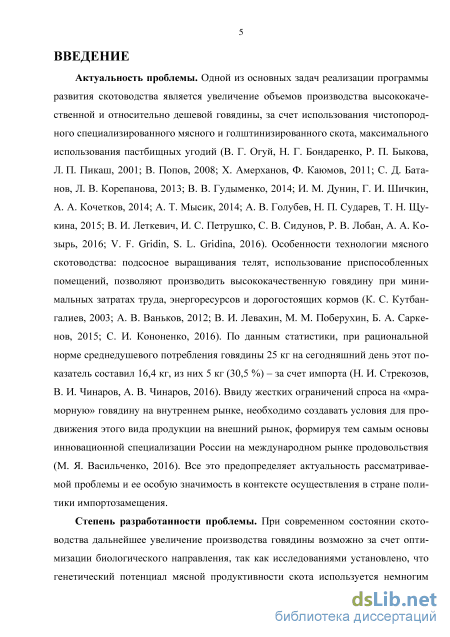 Степень разработанности проблемы. Увеличение производства говядины возможно за счет оптимизации биологического направления, так как исследованиями установлено, что генетический потенциал мясной продуктивности скота используется немногим более чем на 30–50 % (Е.С. Беломытцев, И.П. Заднеп-рянский, 1988; Д.А. Смирнов, Л.Н. Бугрим, 2001; Б. Шалугин, 2006; Н.И. Стре-козов, и др., 2016).