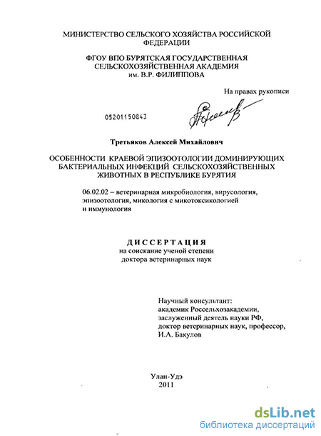 Личный вклад соискателя. Автору принадлежит постановка, разработка темы и её решение. Экспериментальная часть работы по разделам 3.14 и 3.15 выполнена совместно с сотрудниками кафедры микробиологии, вирусологии и ветеринарно-санитарной экспертизы ФГОУ ВПО БГСХА В.Ц. Цыдыповым и Р.Н. Бадмажаповой, что нашло отражение в списке публикаций по теме исследований, по другим разделам диссертации выполнена лично соискателем.