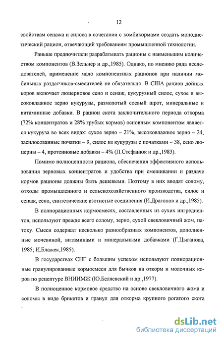 В.П.Славов и др. (1986) считают, что биологически приемлемым при откорме молодняка крупного рогатого скота в Полесье Украины является скармливание гранулированных кормосмесей с высокой удельной массой соломы в сочетание с силосом. При этом значительно сокращается продолжительность привыкания животных к поеданию неадекватных кормов и не наблюдается пассивности в кормлении, отмеченном при переходе на гранульные рационы.