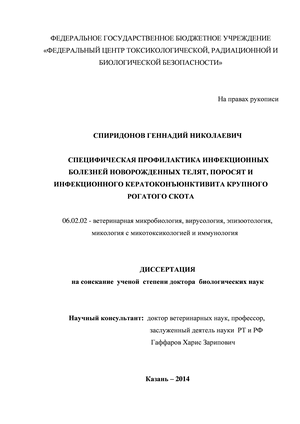 Методология и методы исследований. Работа выполнена в период с 1993 по 2013 гг. в лаборатории по изучению болезней молодняка ФГБУ «ФЦТРБ-ВНИВИ» (г. Казань), результаты исследований апробированы в сельскохозяйственных предприятиях Среднего Поволжья и Предуралья, неблагополучных по желудочно-кишечным заболеваниям новорожденных телят и поросят, а также инфекционному кератоконъюнктивиту крупного рогатого скота. Отдельные этапы работы были выполнены с участием кандидатов наук Ефимовой М.А., Валебной Л.В., Дуплевой Л.Ш., Романова Е.А., Махмутова А.Ф. и Саттаровой Н.В., которым выражаю искреннюю признательность.
