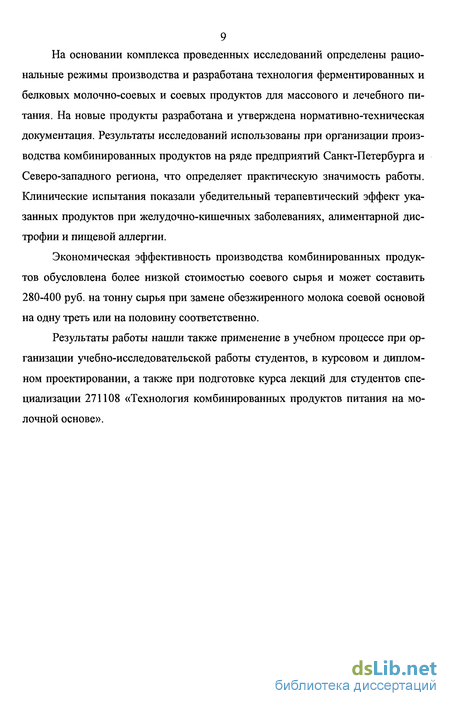 На основании комплекса проведенных исследований определены рациональные режимы производства и разработана технология ферментированных и белковых молочно-соевых и соевых продуктов для массового и лечебного питания. На новые продукты разработана и утверждена нормативно-техническая документация. Результаты исследований использованы при организации производства комбинированных продуктов на ряде предприятий Санкт-Петербурга и Северо-западного региона, что определяет практическую значимость работы. Клинические испытания показали убедительный терапевтический эффект указанных продуктов при желудочно-кишечных заболеваниях, алиментарной дистрофии и пищевой аллергии.