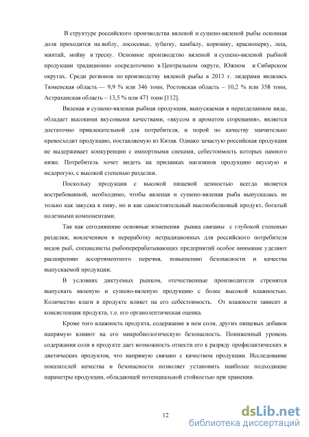 В России производство вяленой и сушено-вяленой рыбной продукции, относящейся к продукции с промежуточной влажностью, согласно классификациям, принятым в мировой практике (K. Ross, R. Davies, Б. А. Баранов), не в полной мере соответствует отечественному спросу и обеспечению конкурентоспособности на мировом рынке. Основные требования рынка - это повышение потребительской привлекательности за счет глубокой степени разделки сырья, обеспечения населения безопасными продуктами питания с пролонгированными сроками годности.