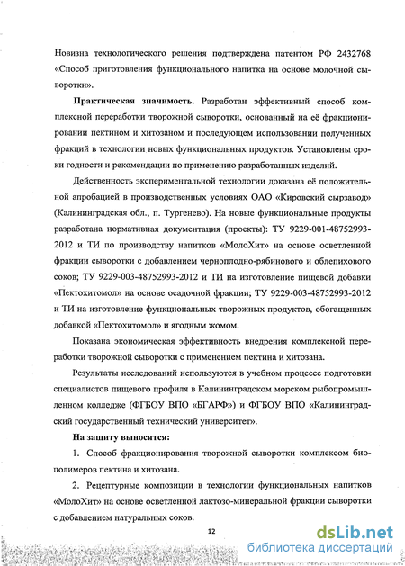 Научная новизна работы. Научно обоснованы фундаментально-прикладные основы технологии фракционирования творожной сыворотки комплексом высокоэтерифицированного пектина и высокомолекулярного хитозана, позволяющие изготавливать с применением полученных фракций новые функциональные гастрономически привлекательные продукты. Исследовано влияние различных видов хитозана на эффективность осаждения сухих веществ творожной сыворотки. Изучены основные зависимости процесса разделения творожной сыворотки на осветленную лактозо-минеральную и осадочную белково-углеводную фракции при варьировании температуры, кислотности сыворотки, продолжительности экспозиции биополимеров. Получены математические модели процесса фракционирования, адекватно связывающие качество целевых продуктов с дозировками биополимеров. Исследовано качество лактозо-минеральной и белково-углеводной фракций сыворотки, показатели которого свидетельствуют об их высоком биопотенциале. Обоснованы рецептуры, пищевая ценность, повышенная хранимоспособность функциональных сокосодержащих напитков на основе осветленной фракции сыворотки, пищевой добавки на основе белково-углеводной фракции и обогащенных ею функциональных творожных продуктов, комплексно использующих ценные компоненты ягод облепихи и черноплодной рябины. Новизна технологического решения подтверждена патентом РФ 2432768 «Способ приготовления функционального напитка на основе молочной сыворотки».