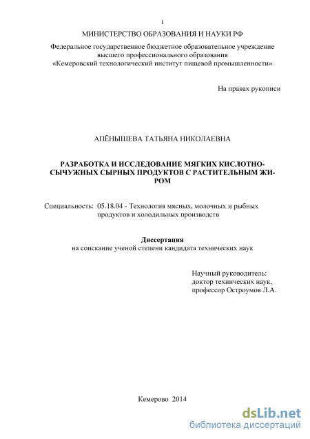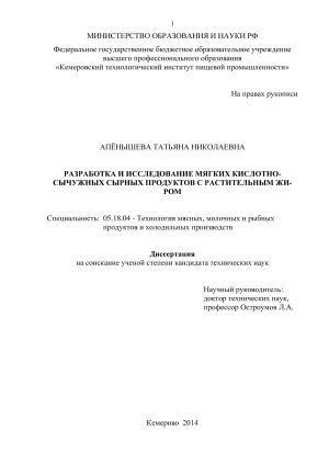 Серия работ, выполненных исследователями Кемеровского технологического института пищевой промышленности, посвященная использованию растительных жиров при производстве мягких сыров, вырабатываемых методами кислотно-сычужной и термокислотной коагуляции белков.