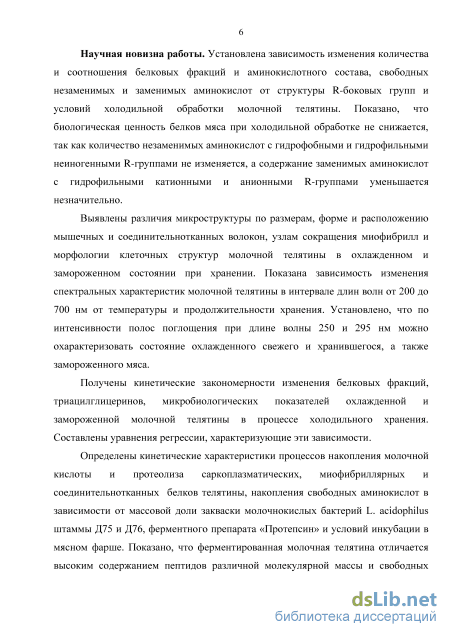 Научная новизна работы. Установлена зависимость изменения количества и соотношения белковых фракций и аминокислотного состава, свободных незаменимых и заменимых аминокислот от структуры R-боковых групп и условий холодильной обработки молочной телятины. Показано, что биологическая ценность белков мяса при холодильной обработке не снижается, так как количество незаменимых аминокислот с гидрофобными и гидрофильными неиногенными R-группами не изменяется, а содержание заменимых аминокислот с гидрофильными катионными и анионными R-группами уменьшается незначительно.