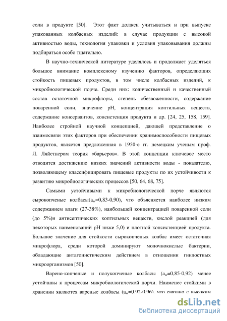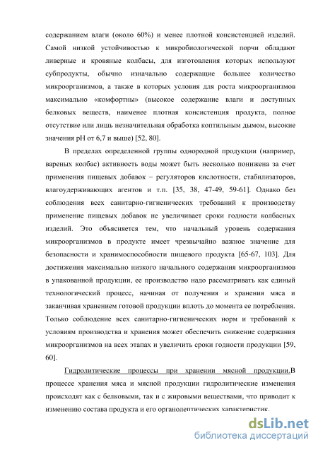 Важнейшей характеристикой мясной продукции, определяющей ее устойчивость к развитию микробиологической порчи, является активность воды (aw). Чем выше активность воды в продукте, тем более «комфортно» чувствуют себя микроорганизмы, и тем выше скорость их размножения. Снижение активности воды тормозит не только микробиологические процессы, но и биохимические, в том числе ферментативные. Для каждого вида колбасных изделий характерна своя величина активности воды, которая зависит от массовой доли влаги, массовой доли сухих веществ и поваренной соли в продукте [50]. Этот факт должен учитываться и при выпуске упакованных колбасных изделий: в случае продукции с высокой активностью воды, технология упаковки и условия упаковывания должны подбираться особо тщательно.