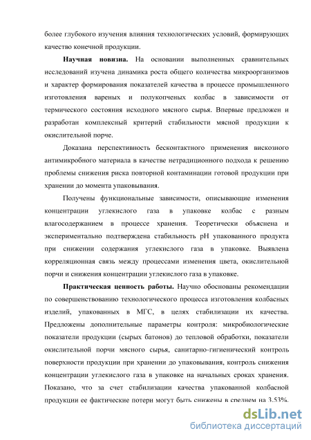 Научная новизна этой части исследований представлялась, прежде всего, в том, что была прослежена динамика изменения микробиологических показателей по всей цепи производства и хранения колбасной продукции, упакованной в МТС, от сырья до окончания сроков годности, а также получены новые данные о стабильности показателей колбас, изготовленных из охлажденного и размороженного мяса, в процессе их хранения.