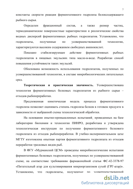 Актуальность темы. Продукты, содержащие различные аминокислоты и их производные, в настоящее время широко используются в пищевой, микробиологической промышленности, медицине и в производстве комбикормов. Одно из ведущих мест среди таких продуктов занимают ферментативные белковые гидролизаты, получаемые из отходов переработки гидробионтов, в том числе рыбы, добываемой в морях и океанах. Задача разработки эффективных технологий рыбных гидролизатов является актуальной, поскольку она неразрывно связана с проблемой безотходного рационального использования морских биологических ресурсов, что чрезвычайно важно как с научной, так и с экономической точки зрения.