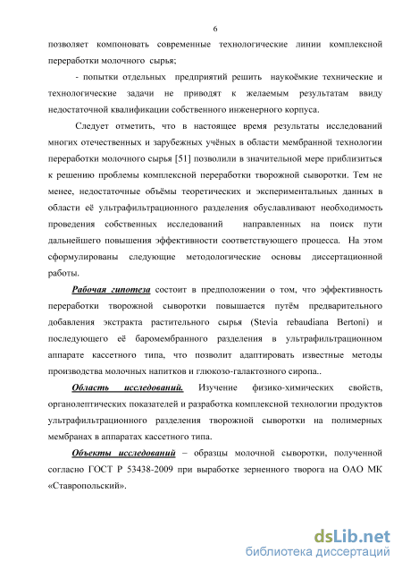 Область исследований. Изучение физико-химических свойств, органо-лептических показателей и разработка комплексной технологии продуктов ультрафильтрационного разделения творожной сыворотки на полимерных мембранах в аппаратах кассетного типа.