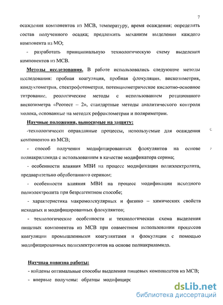 Предмет исследования - особенности процесса модификации флокулянтов, макромолекулярные и физико-химические свойства растворов полиэлектролитов, особенности процесса выделения пищевых компонентов из МСВ при совместном действии на них промышленных коагулянтов и модифицированных флокулянтов, механизм модификации флокулянтов, механизм осаждения белков и жиров из МСВ.