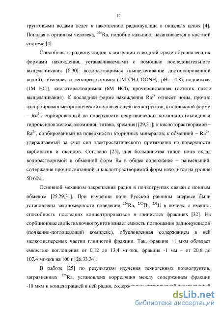 Известно, что попадая в окружающую среду, радионуклиды концентрируются в почвогрунтах и вступают в различного рода физико химические, биохимические реакции с их компонентами. Прочность фиксации радионуклидов определяется многими факторами: фракционным и минералогическим составом почвогрунтов, наличием органических соединений, влагосодержанием, временем от начала загрязнения и др. [26]. Радий, являясь представителем элементов II группы периодической системы Д.И. Менделеева, обладает устойчивой степенью окисления +2. Его химическое поведение чрезвычайно похоже на поведение бария [27]. Вследствие большого ионного радиуса не склонен к комплексообразованию (имеется информация об образовании комплексов с лимонной кислотой, ЭДТА) [28]. Характерным свойством радия является способность к соосаждению с гидратированными оксидами железа, карбонатами и сульфатами кальция, магния, сорбция на глинистых минералах, коллоидной кремниевой кислоте [29]. Водорастворимыми соединениями радия являются хлориды, нитраты, бромиды, слаборастворимыми – сульфаты, карбонаты, фосфаты, оксалаты и др.