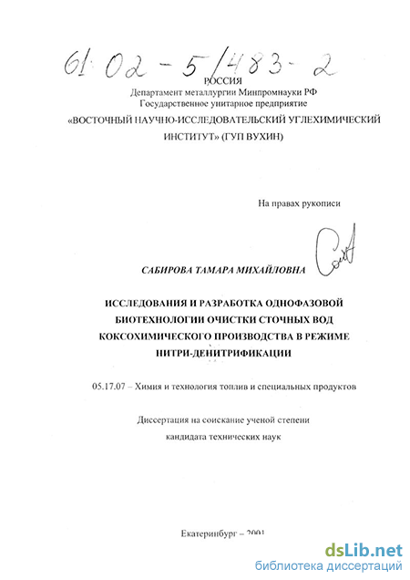 Сабирова Тамара Михайловна. Исследования и разработка однофазовой биотехнологии очистки сточных вод коксохимического производства в режиме нитри-денитрификации : диссертация ... кандидата технических наук : 05.17.07.- Екатеринбург, 2001.- 184 с.: ил. РГБ ОД, 61 02-5/483-2