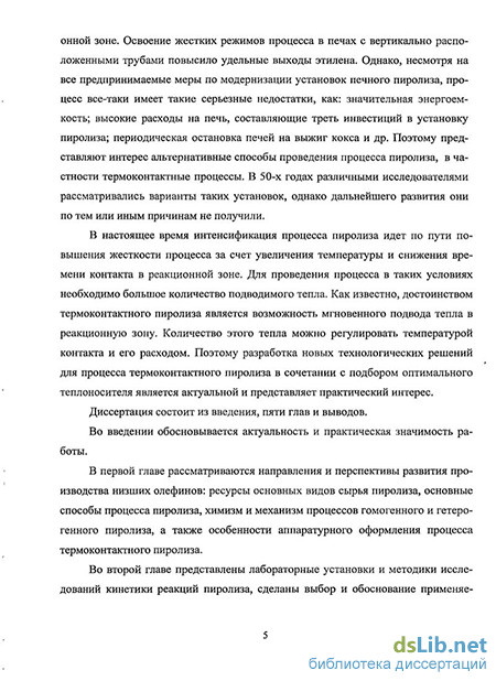 Основным источником получения низших олефинов является гомогенный пиролиз в трубчатых печах. Данная технология имеет следующие недостатки: расходы на печи составляют треть инвестиций в установку пиролиза, высокая энергоемкость процесса, периодическая остановка печей на выжиг кокса, использование дорогостоящих ингибиторов. В связи с этим представляют интерес разработки альтернативных технологических процессов. К их числу относятся и термоконтактные процессы пиролиза (ТКП), разработка которых качалась ещё в 50-х годах XX века.