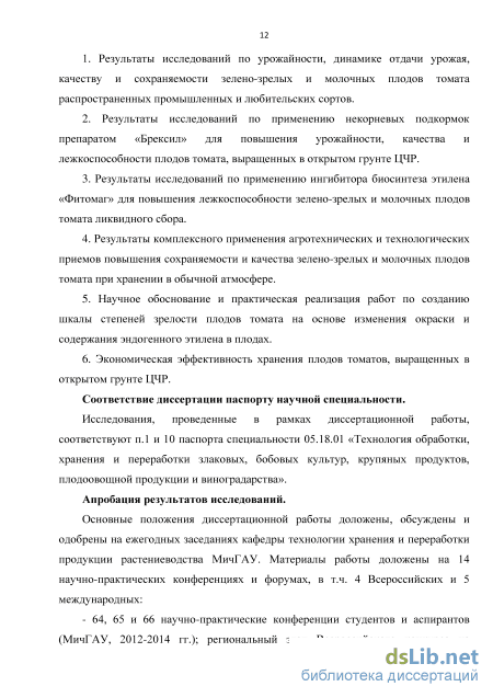 Цель диссертационной работы: теоретическое обоснование и практическое применение эффективных способов выращивания плодов томата в открытом грунте ЦЧР и их хранения в обычной атмосфере.
