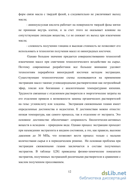 СОг-экстракт виноградных косточек представляет собой маслянистую прозрачную жидкость желтовато-зеленоватого цвета с приятным запахом и горьковатым привкусом. Масло, полученное исчерпывающей экстракцией диэтиловым эфиром, представляет собой маслянистую жидкость зеленоватого цвета, так же с приятным запахом и горьковатым привкусом. Масло, полученное методом холодного отжима на лабораторном гидравлическом прессе при усилии сжатия 100 kN/см и времени выдерживания 15 мин., представляет собой маслянистую жидкость желтоватого цвета с приятным запахом и пикантным вкусом. Масла, полученные прессовым способом, экстракцией диэтиловым эфиром и СО2-экстракт были проанализированы методом тонкослойной хроматографии.