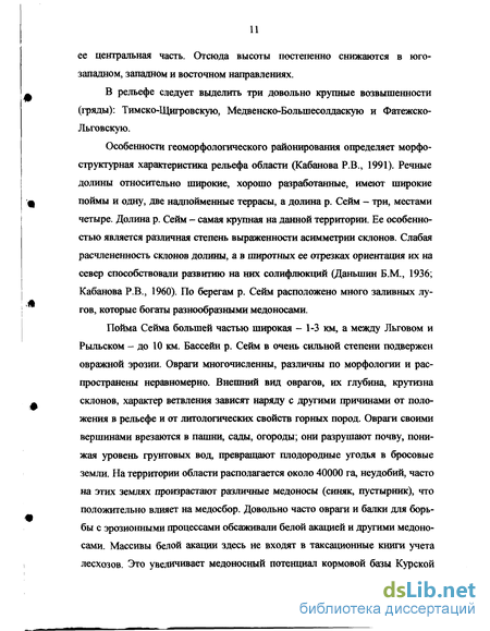 Особенности геоморфологического районирования определяет морфо-структурная характеристика рельефа области (Кабанова Р.В., 1991). Речные долины относительно широкие, хорошо разработанные, имеют широкие поймы и одну, две надпойменные террасы, а долина р. Сейм - три, местами четыре. Долина р. Сейм - самая крупная на данной территории. Ее особенностью является различная степень выраженности асимметрии склонов. Слабая расчлененность склонов долины, а в широтных ее отрезках ориентация их на север способствовали развитию на них солифлюкций (Данынин Б.М., 1936; Кабанова Р.В., 1960). По берегам р. Сейм расположено много заливных лугов, которые богаты разнообразными медоносами.