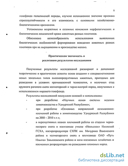 Полученные результаты исследований расширяют и дополняют теоретические и практические аспекты основ создания и совершенствования новых зональных типов высокопродуктивных животных, пригодных для разведения в условиях промышленной технологии, и молочных стад крупного рогатого скота холмогорской и черно-пестрой пород, полученных с использованием мирового генофонда.
