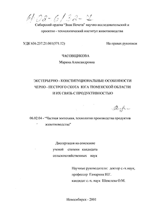 Часовщикова Марина Александровна. Экстерьерно-конституциональные особенности черно-пестрого скота юга Тюменской области и их связь с продуктивностью : диссертация ... кандидата сельскохозяйственных наук : 06.02.04.- Новосибирск, 2001.- 153 с.: ил. РГБ ОД, 61 02-6/32-7