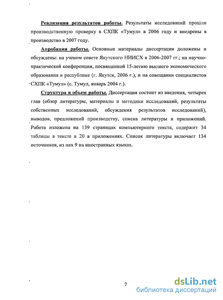 Апробация работы. Основные материалы диссертации доложены и обсуждены: на ученом совете Якутского НИИСХ в 2006-2007 гг.; на научно-практической конференции, посвященной 15-летию высшего экономического образования в республике (г. Якутск, 2006 г.), и на совещании специалистов 'СХПК «Тумул» (с. Тумул, январь 2004 г.).