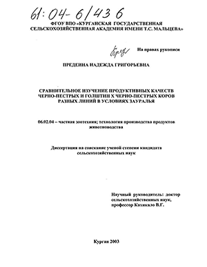 Предеина Надежда Григорьевна. Сравнительное изучение продуктивных качеств черно-пестрых и голштин Х черно-пестрых коров разных линий в условиях Зауралья : Дис. ... канд. с.-х. наук : 06.02.04 : Курган, 2003 141 c. РГБ ОД, 61:04-6/436