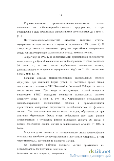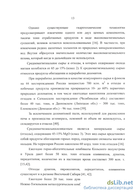 По прогнозу на 1997 г. на обогатительных предприятиях производства минеральных удобрений количество магнийсодержащих отходов достигает 30 млн. т.; в том числе карбонатные магниевые шламы, доломитизированные смеси с содержанием MgO до 7-14% составляют более 2 млн. т. [15].