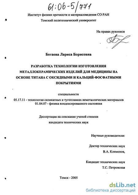 Ботаева Лариса Борисовна. Разработка технологии изготовления металлокерамических изделий для медицины на основе титана с оксидными и кальций-фосфатными покрытиями : диссертация ... кандидата технических наук : 05.17.11, 01.04.07.- Томск, 2005.- 144 с.: ил. РГБ ОД, 61 06-5/771
