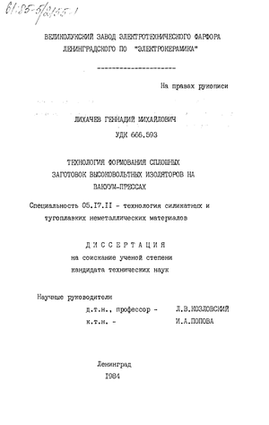 Научная новизна. На основании систематического исследования процесса формования высоковольтных опорных стержневых изоляторов из фарфоровых масс на вакуум-прессе: