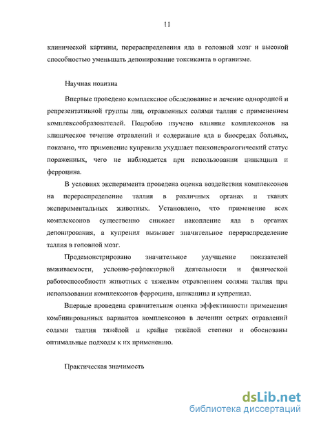 Впервые проведено комплексное обследование и лечение однородной и репрезентативной группы лиц, отравленных солями таллия с применением комплексообразователей. Подробно изучено влияние комплексонов на клиническое течение отравлений и содержание яда в биосредах больных, показано, что применение купренила ухудшает психоневрологический статус пораженных, чего не наблюдается при использовании цинкацина и ферроцина.