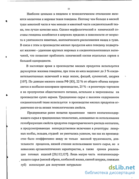 Предпринятые ранее попытки применение такого коллагеносодер-жащего сырья в традиционных технологиях, основанные на использовании гелеобразующих свойств продуктов гидротермического распада коллагена, и предусматривающее непосредственное включение в рецептуры ливерных колбас, зельцев, студней не увенчались успехом, так как их производство было неэффективно ввиду не только высокой трудоемкости, длительности процессов, низкой степени использования такого сырья, но и невысоких органолептических характеристик, а также сроков реализации готовых изделий [20,112,127]. Лишь малую часть коллагеносодер-жащего сырья (мясной обрези, колбасной жилки, свиной шкурки, говяжьих губ) используют для получения натурального белкового стабилизатора применительно к технологии вареных, ливерных колбас и мясных хлебов; бульонов с высокой долей клейдающих веществ для заливки консервов, субпродуктового фарша, наборов для домашнего студня [59]. Однако почти половина коллагеносодержащего сырья не используется в промышленной переработке [83].