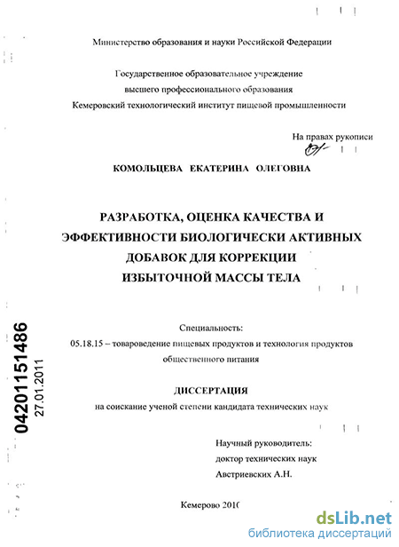Работа обсуждена на совместном заседании кафедры товароведения и управления качеством, НИИ биотехнологии и сертификации пищевых продуктов ГОУ ВПО Кемеровский технологический институт пищевой промышленности и рекомендована к защите.