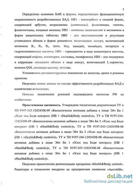 Практическая значимость. Утверждена техническая документация ТУ и ТИ 9197-243-12424308-09 «Биологически активная добавка к пище Эйч Би 1 «Хэле энд Боди контрол» (НВ 1 «Health&Body control»)», ТУ и ТИ 9197-244-12424308-09 «Биологически активная добавка к пище Эйч Би 2 «Хэле энд Боди контрол» (НВ 1 «Health&Body control»)», ТУ и ТИ 9197-245-12424308-08 «Биологически активная добавка к пище Эйч Би 3 «Хэле энд Боди контрол» (НВ 1 «Health&Body control»)», ТУ и ТИ 9197-246-12424308-08 «Биологически активная добавка к пище Эйч Би 1 «Хэле энд Боди контрол» (НВ 1 «Health&Body control»)», ТУ и ТИ 9197-247-12424308-08 «Биологически активная добавка к пище Эйч Би 1 «Хэле энд Боди контрол» (НВ 1 «Health&Body control»)».