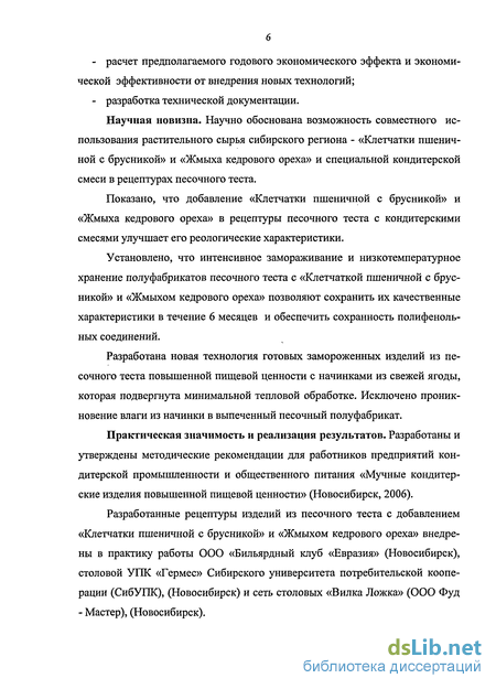 Научная новизна. Научно обоснована возможность совместного использования растительного сырья сибирского региона - «Клетчатки пшеничной с брусникой» и «Жмыха кедрового ореха» и специальной кондитерской смеси в рецептурах песочного теста.