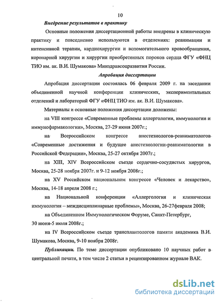 Основные положения диссертационной работы внедрены в клиническую практику и повседневно используются в отделениях: реанимации и интенсивной терапии, кардиохирургии и вспомогательного кровообращения, коронарной хирургии и хирургии приобретенных пороков сердца ФГУ «ФНЦ ТИО им. ак. В.И. Шумакова» Минздравсоцразвития России.