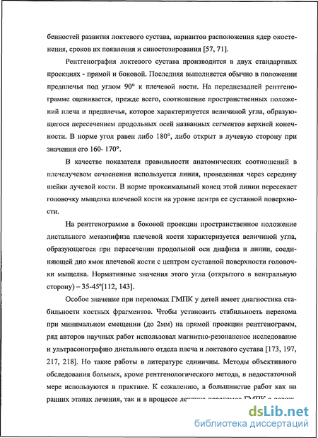 На рентгенограмме в боковой проекции пространственное положение дистального метаэпифиза плечевой кости характеризуется величиной угла, образующегося при пересечении продольной оси диафиза и линии, соединяющей дно ямок плечевой кости с центром суставной поверхности головочки мыщелка. Нормативные значения этого угла (открытого в вентральную сторону) -35-45[112, 143].