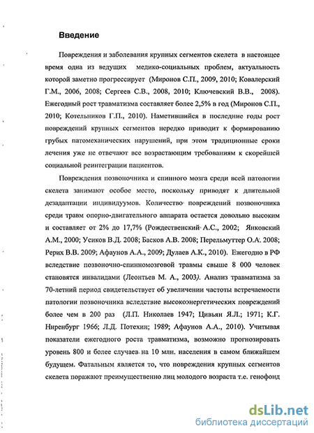 Повреждения позвоночника и спинного мозга среди всей патологии скелета занимают особое место, поскольку приводят к длительной дезадаптации индивидуумов. Количество повреждений позвоночника среди травм опорно-двигательного аппарата остается довольно высоким и составляет от 2% до 17,7% (Рождественский А.С., 2002; Янковский A.M., 2000; Усиков В.Д. 2008; Басков А.В. 2008; Перельмуттер О.А. 2008; Рерих В.В. 2009; Афаунов А.А., 2009; Дулаев А.К., 2010). Ежегодно в РФ вследствие позво-ночно-спинномозговой травмы свыше 8 000 человек становятся инвалидами (Леонтьев М. А. 2003/ Анализ травматизма за 70-летний период свидетельствует об увеличении частоты встречаемости патологии позвоночника вследствие высокоэнергетических повреждений более чем в 200 раз. (Николаев Л.П. 1947; Цивьян Я.Л., 1971; Ниренбург К.Г., 1966; Потехин Л.Д. 1989; Афаунов А.А., 2010). Учитывая показатели ежегодного роста травматизма, возможно прогнозировать уровень 800 и более случаев на 10 млн. населения в самом ближайшем будущем. Фатальным является то, что повреждения крупных сегментов скелета поражают преимущественно лиц молодого возраста т.е. генофонд на-