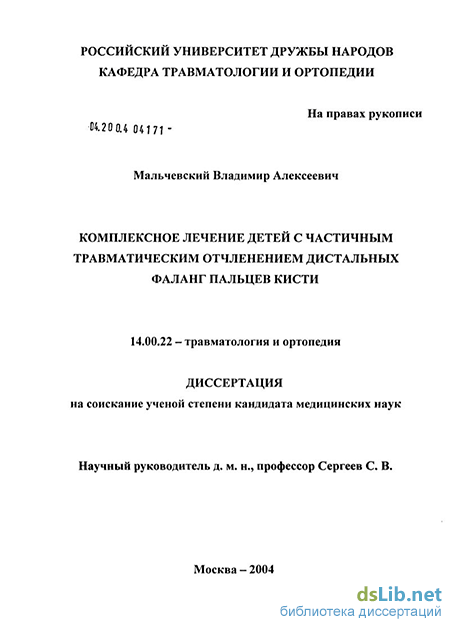Цель исследования Целью нашей работы является улучшение результатов лечения больных детей с частичным травматическим отчленением дистальных фаланг пальцев кисти путем разработки и внедрения в медицинскую практику методики) комплексной реабилитации сочетающей хирургический метод с воздействием низкочастотным переменным электромагнитным полем в остром периоде травмы.