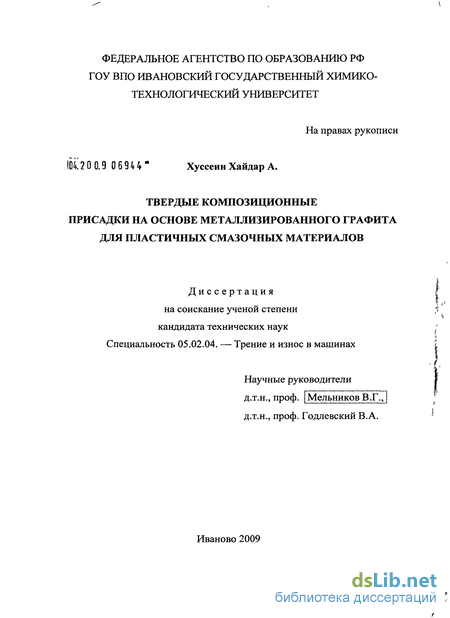 11.Хуссейн Х.А., Волков А.В., Годлевский В.А., Киселев Б.Р. Расчет свободной поверхностной энергии порошка металлизированного графита, применяемого в качестве трибоактивной присадки к пластичным смазочным материалам // Сб. докладов Региональной науч-но-техн. конф. «Материаловедение и надежность триботехнических систем», Иваново, 10 апреля 2009 г., Изд. ИГХТУ. С. 22-25.