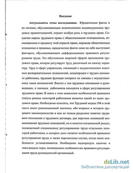 Актуальность темы исследования. Юридические факты и их составы, обуславливающие возникновение индивидуальных трудовых правоотношений, играют особую роль в трудовом праве. Соединяя нормы трудового права с общественными отношениями, относящимися к предмету этой отрасли права, переводя общественные отношения в правовые, юридические факты сами по себе выступают фактором, обуславливающим дифференциацию правового регулирования труда. Это обусловлено широкой сферой применения трудового права, которое регулирует труд, различный по своему характеру. Труд в сфере управления, связанный с осуществлением властных распорядительных полномочий, неоднороден с трудом наемного работника, трудовая функция которого не связана с осуществлением таких полномочий. Вместе с тем трудовые отношения и руководящих, и наемных работников находятся в сфере регулирования трудового права. В связи с этим выявление особенностей правового статуса разных категорий работников является одной из задач трудового права. Необходимо отметить, что Трудовой кодекс РФ в этой части имеет революционной значение, ибо впервые в истории трудового законодательства в нем не только разделено понятие трудового отношения и трудового договора, дан перечень оснований возникновения трудовых отношений, но и имеется специальный раздел, посвященный специальному регулированию труда отдельных категорий работников, в котором дано понятие особенностей правового регулирования труда, а также перечислены случаи, когда такие особенности устанавливаются. Необходимо подчеркнуть наличие в этом разделе норм, посвященных особенностям правового регулирования труда руководителей организаций.