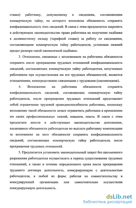 8. В связи с вступлением в силу четвертой части Гражданского кодекса РФ прекращается действие нормы Закона о коммерческой тайне, предусматривающей возможность заключения с работниками соглашения о сохранении конфиденциальности сведений, составляющих коммерческую тайну работодателя, после прекращения трудового договора. Диссертант обосновывает необходимость восстановления в законодательстве действия норм, позволяющих субъектам трудового отношения заключать соглашение о сохранении конфиденциальности сведений, составляющих коммерческую тайну работодателя, после прекращения трудового договора. Предлагается ввести законодательное ограничение предельного срока после прекращения трудового договора, в течение которого на работника может распространяться обязанность сохранения конфиденциальности сведений, составляющих коммерческую тайну бывшего работодателя и его контрагентов.