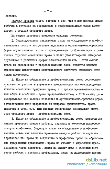 Научная новизна работы состоит в том, что в ней впервые право рабочих и служащих на объединение в профессиональные союзы исследуется с позиций трудового права.