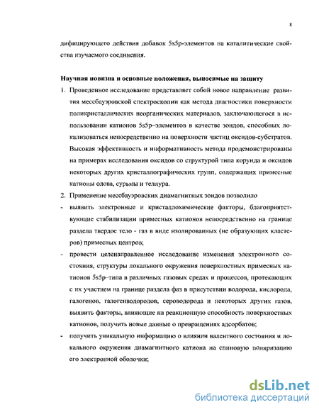 Настоящая диссертация посвящена использованию мессбауэровской спектроскопии для диагностики поверхности оксидных материалов с помощью примесных ионов mSn, l21Sb и 125Те, электронные свойства которых обеспечивают их локализацию непосредственно на границе раздела твердое тело — газ без образования кластеров примесного компонента. Предлагаемый в работе подход к исследованию поверхности заключается в анализе изменений электронного состояния, локального окружения ионов-зондов в различных газовых средах и их динамических (колебательных) свойств с целью получения ранее недоступной информации о протекающих на границе раздела фаз процессах. Таким образом, мессбауэровская спектроскопия может стать эффективным инструментом решения новых важных задач химии твердого тела, в частности, определения особенностей состояния примеси и ее влияния на свойства субстрата. В тоже время примесные ионы, спектральные параметры которых отражают изменение состава и свойств содержащей эти ионы поверхностной фани, становятся специфическим индикаторами состояния соответствующего участка поверхности.