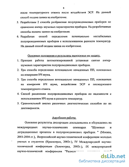 В диссертации получены следующие научно — технические результаты: 1. Исследование зависимости НЧ шума транзисторов от типа перехода, от ампер - шумовой характеристики при малых и больших токах позволило разработать три новых диагностических способа. На способы поданы заявки на изобретения и уже получен один патент (N 2234163 от 7.04.2003) 2. Исследование зависимости НЧ шума транзисторов от воздействия электростатических разрядов и последующего отжига позволило разработать три новых диагностических способа. На способы поданы заявки на изобретения и уже получено два патента (N 22303335 OT21.10.2002 И N 2234104 от26. 02.2003) 3. Исследование зависимости НЧ шума полупроводниковых резисторов от воздействия ЭСР и последующего отжига позволило разработать способ разделения полупроводниковых приборов по надежности. На способ подана заявка на изобретение. 4. Разработана установка для автоматического снятия ампер — шумовых характеристик ПП. На принцип положенный в основу установки, подана заявка на изобретение. 5. Проведена оценка достоверности разработанных диагностических способов по сравнению с испытаниями на надежность. Получено, что предложенные способы оценки шумов приборов с использованием ЭСР и температурного отжига, имеют достоверность не хуже 0.91 - 0.94, т. е. эти способы можно рекомендовать для внедрения в производство транзисторов вместо электротермотренировки